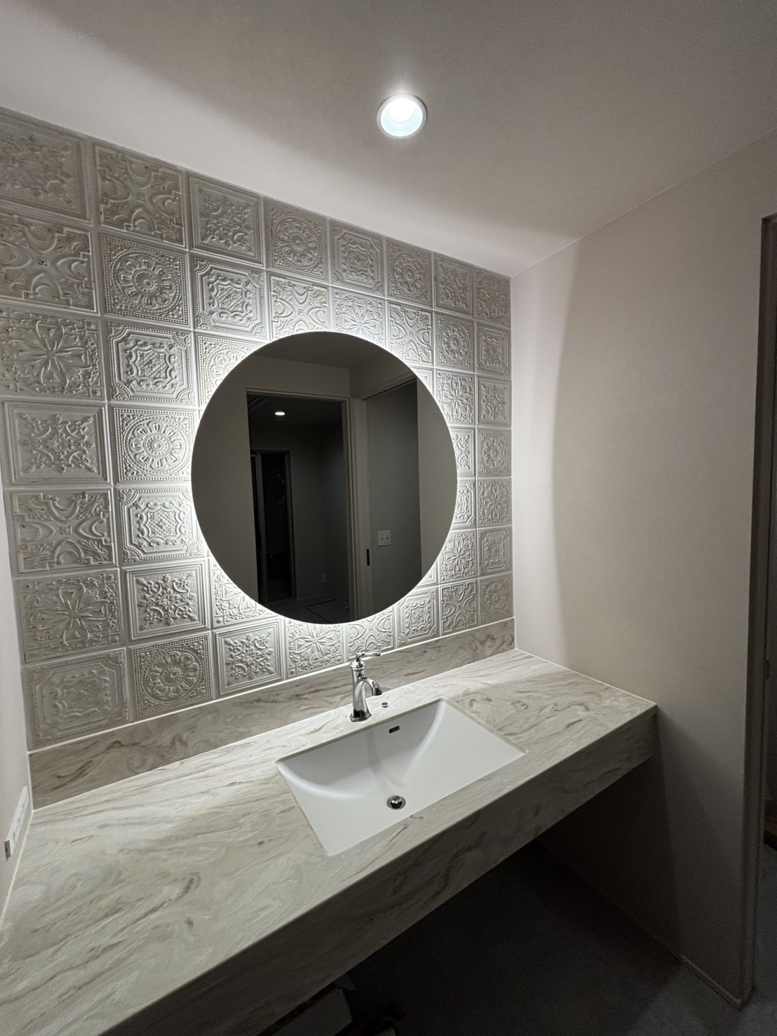 器具選定に合わせた配線・スイッチ接続、取付位置の調整、点灯確認まで対応し、まぶしさを抑えつつ洗面まわりを美しく照らす仕上がりに整えます。
